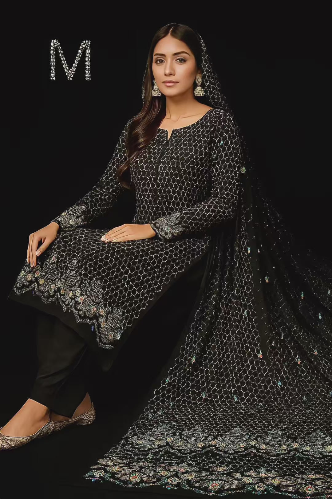 Crafted from premium chiffon, this masterpiece captures the grace of tradition and the glow of modern luxury. The deep black fabric drapes like liquid silk, adorned with intricate golden embroidery that shimmers with every movement.