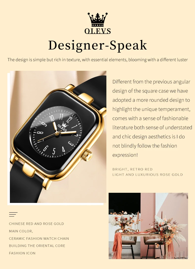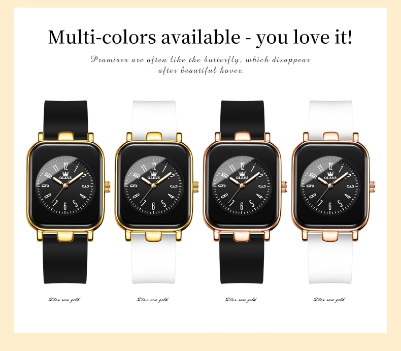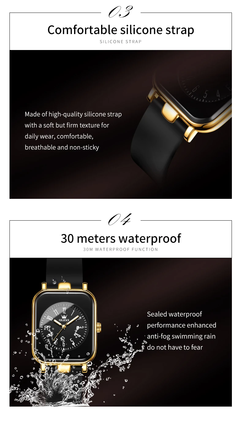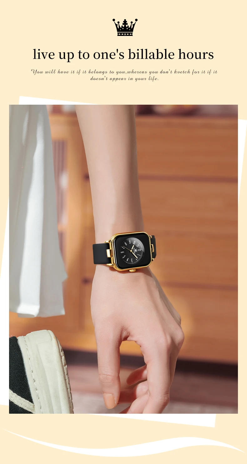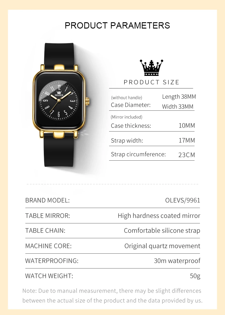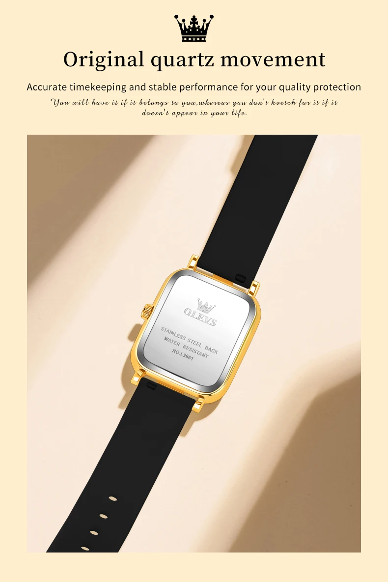 Discover the OLEVS square quartz watch, designed for women who appreciate simplicity and style. Featuring a trendy silicone strap, this timepiece offers durability and comfortable wear throughout the day. Its minimalist square face ensures easy readability while complementing any outfit. Expertly crafted, this watch combines modern design with reliable quartz movement for precise timekeeping. Available exclusively at Mohammad Collection, this accessory blends fashion with function for your everyday elegance.