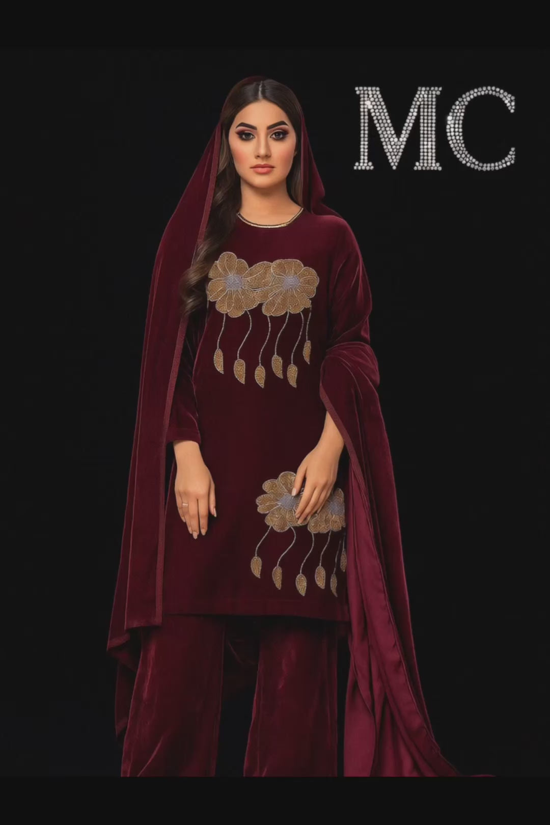 Where elegance finds its voice โ The Margaret Royal Velvet from MC Diamond is a celebration of luxury and grace. Crafted from rich maroon velvet, it carries a regal sheen that softly catches the light. Intricate golden embroidery blooms across the fabric, creating a design thatโs both delicate and commanding.