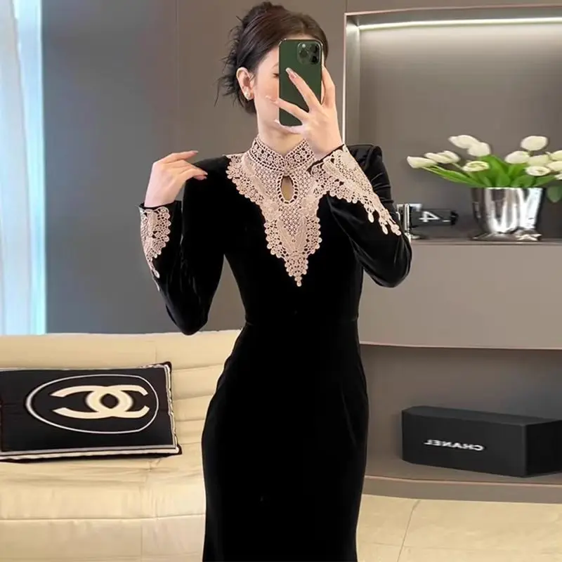 Autumn and Winter New French High-end Black Temperament Slimming Bottom Dress to Wear and Slim Slim Long Sleeves Dresses