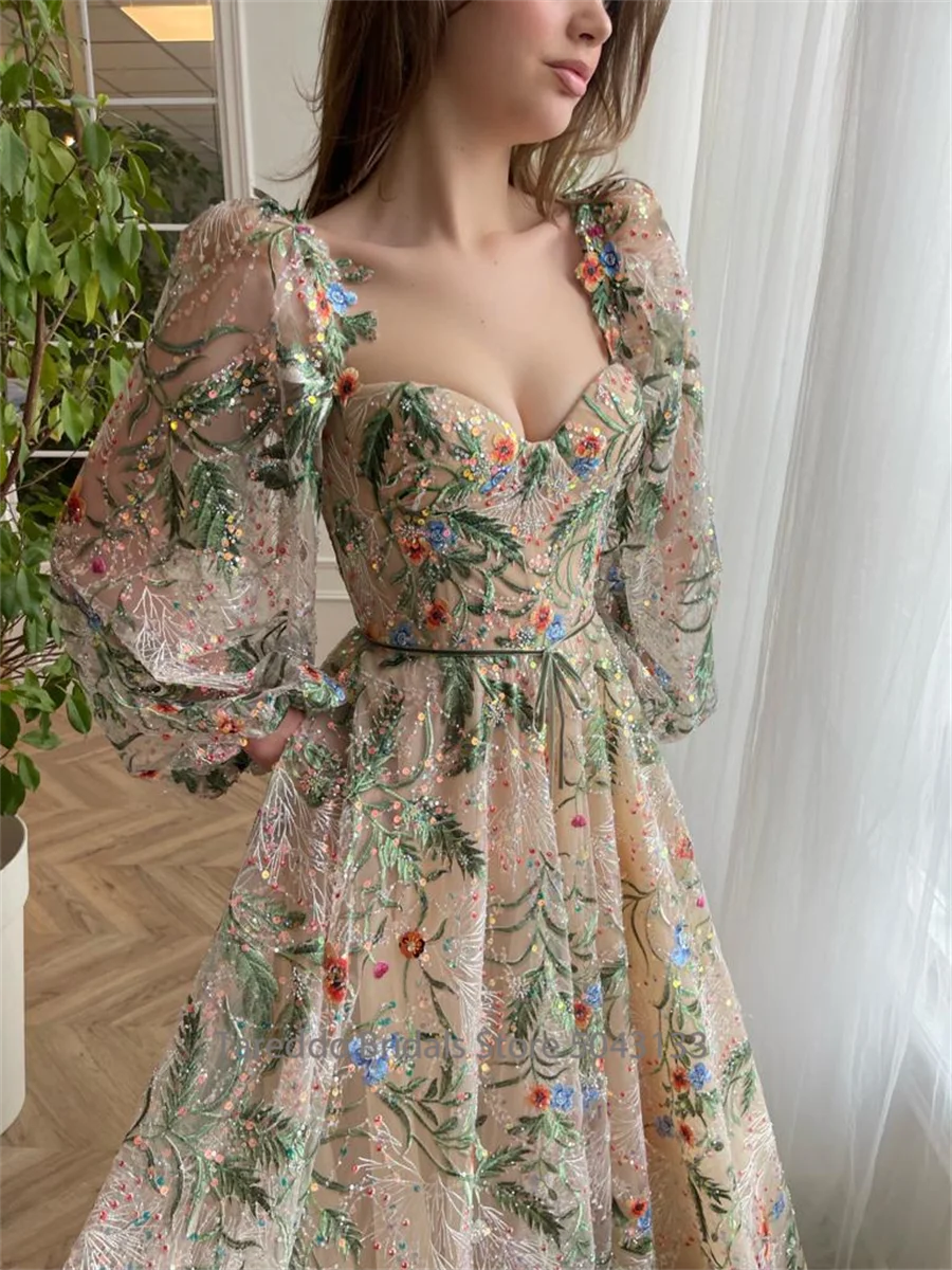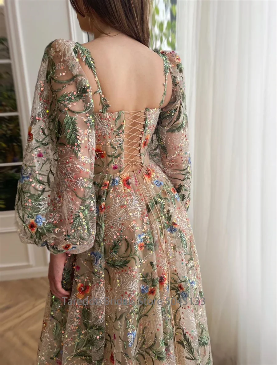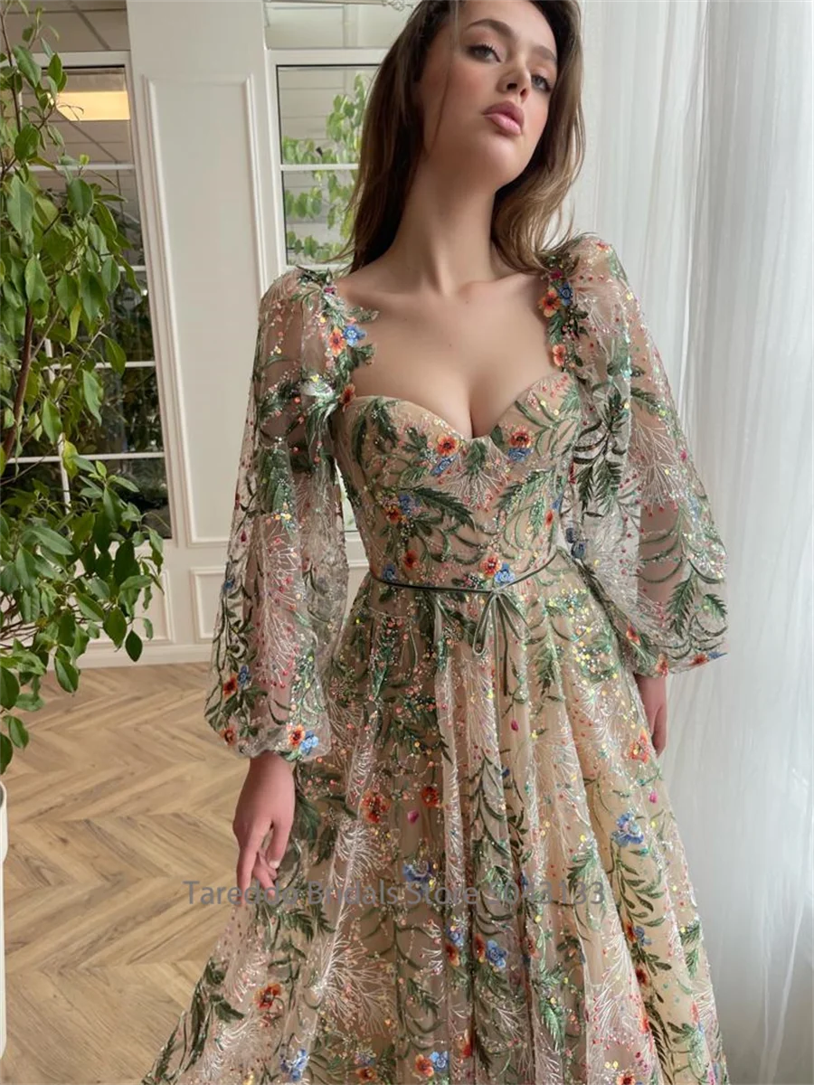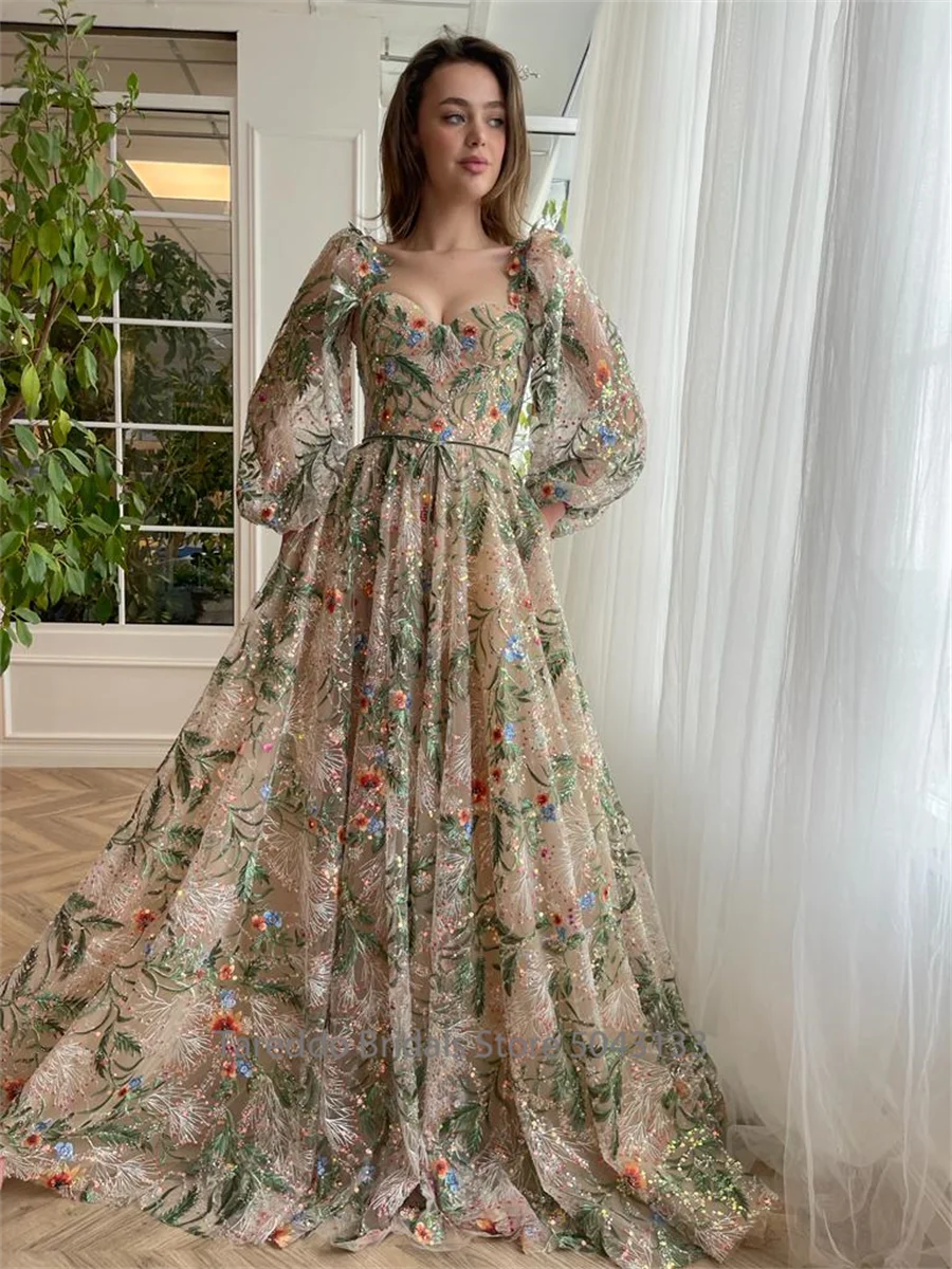 Customized Long Sleeves Floral Embroidery Lace Prom Gown Opulent Luxurious Lace Breathtaking Evening Dress