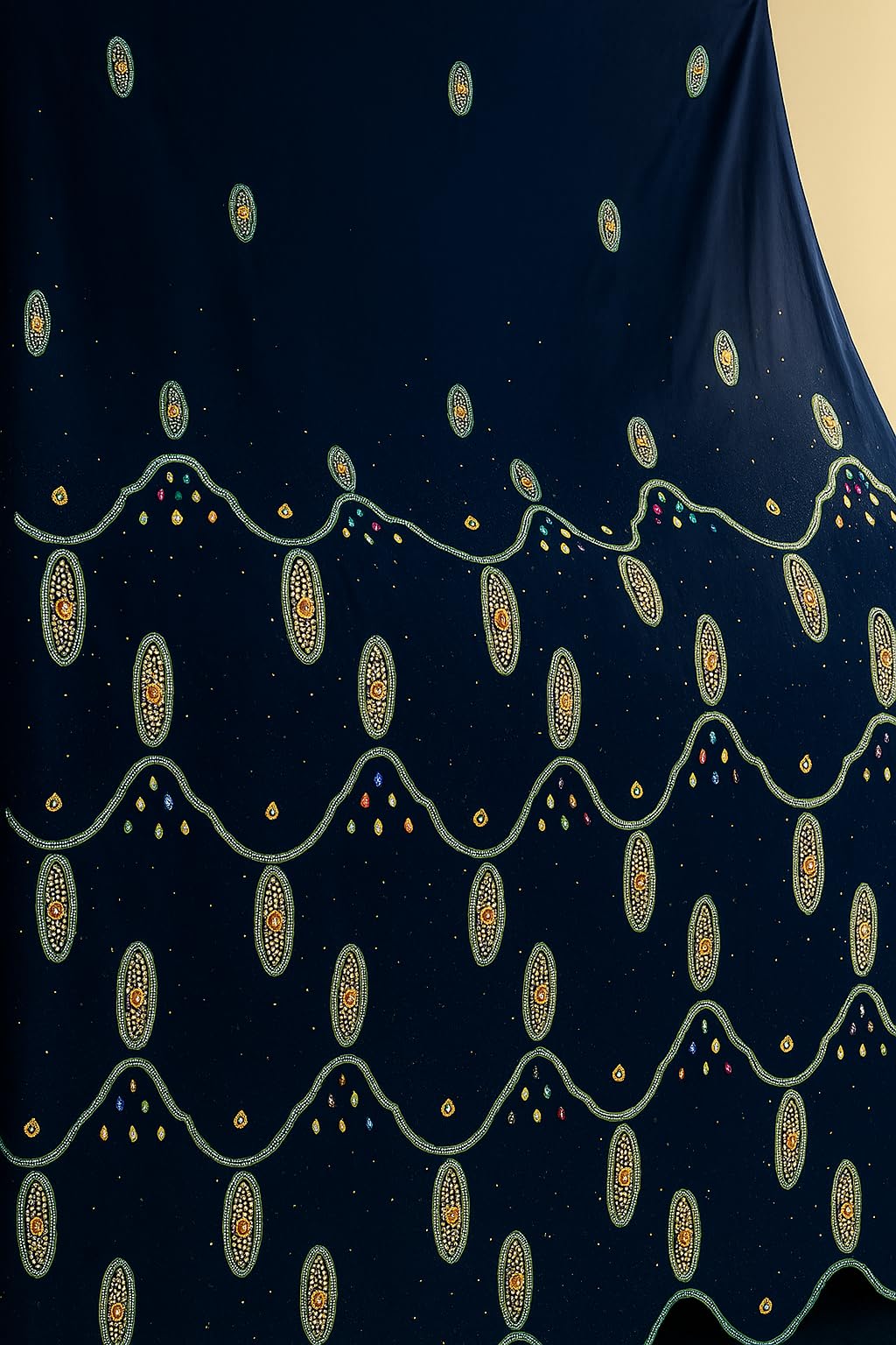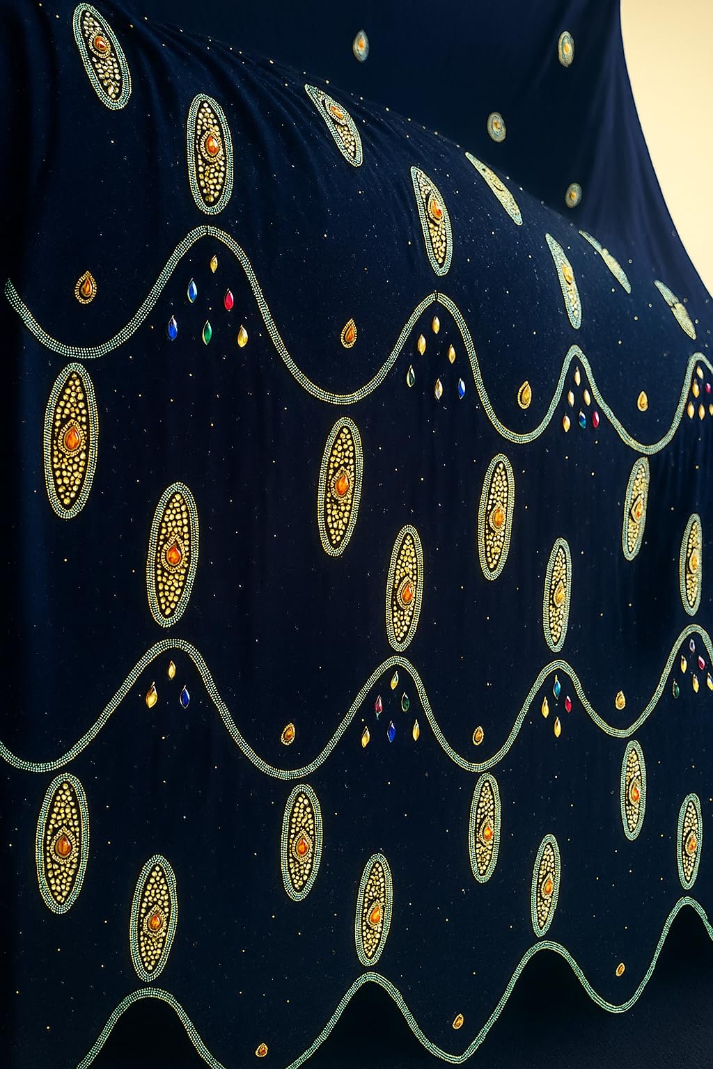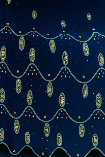 - Deep navy blue base fabric with a rich, royal appeal Intricately hand-embellished oval bead motifs in orange, gold, and emerald accents Embroidery aligned in wavy horizontal patterns for elegant drape Features multi-color small bead clusters between waves for added sparkle Lightweight and flowyโideal for formal wear, evening gowns, or cultural dresses Beadwork radiates under lighting, perfect for luxury styling Premium craftsmanship with symmetrical repeat pattern