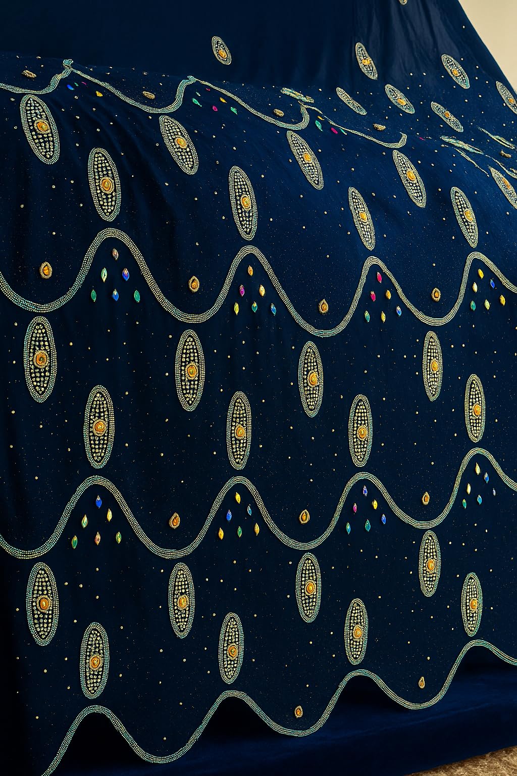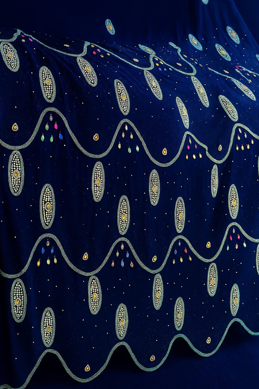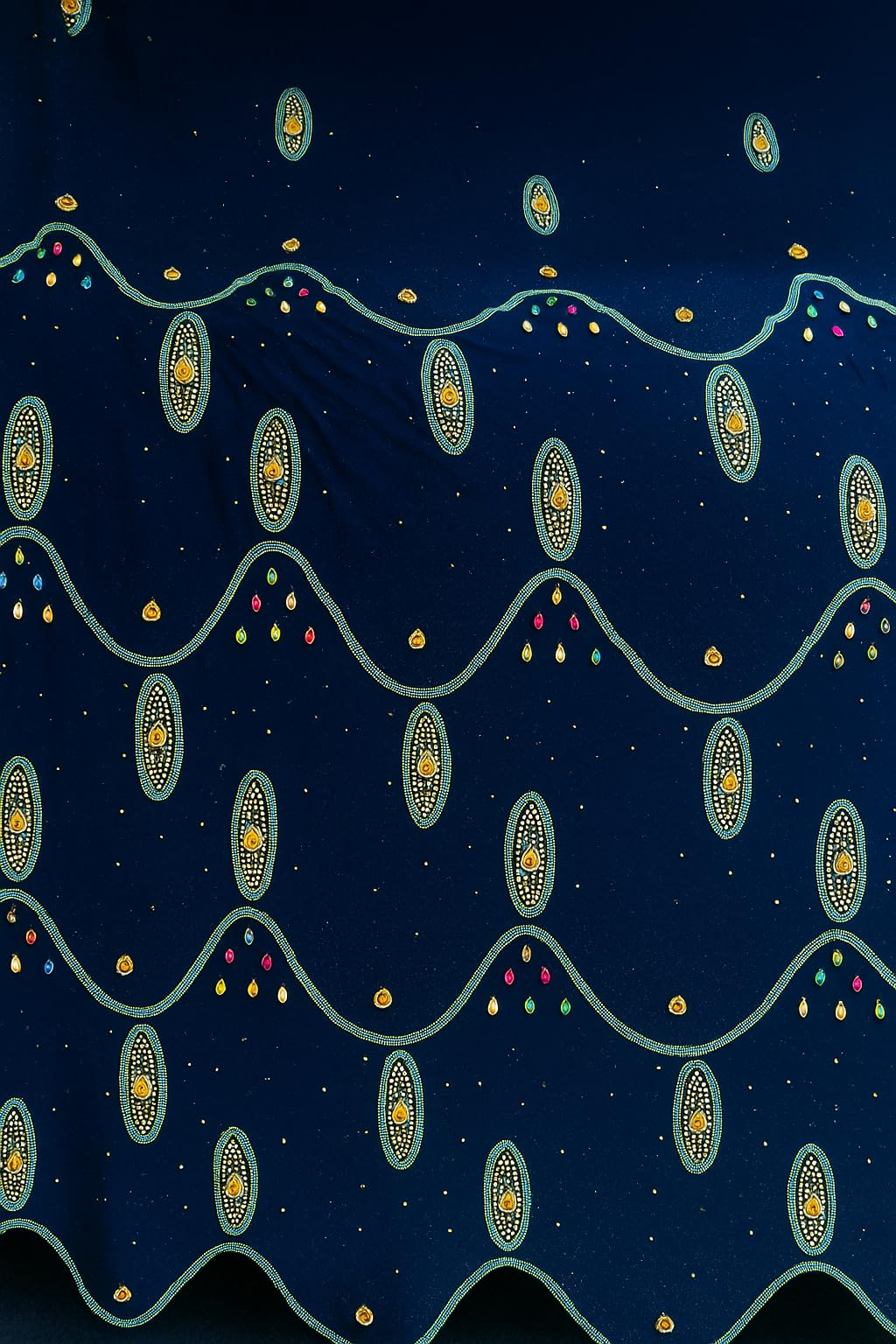- Deep navy blue base fabric with a rich, royal appeal Intricately hand-embellished oval bead motifs in orange, gold, and emerald accents Embroidery aligned in wavy horizontal patterns for elegant drape Features multi-color small bead clusters between waves for added sparkle Lightweight and flowyโideal for formal wear, evening gowns, or cultural dresses Beadwork radiates under lighting, perfect for luxury styling Premium craftsmanship with symmetrical repeat pattern