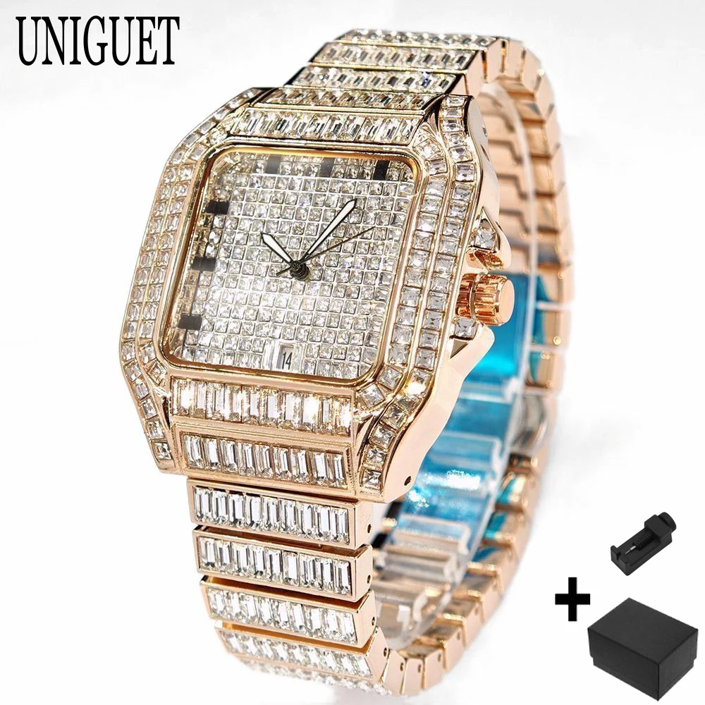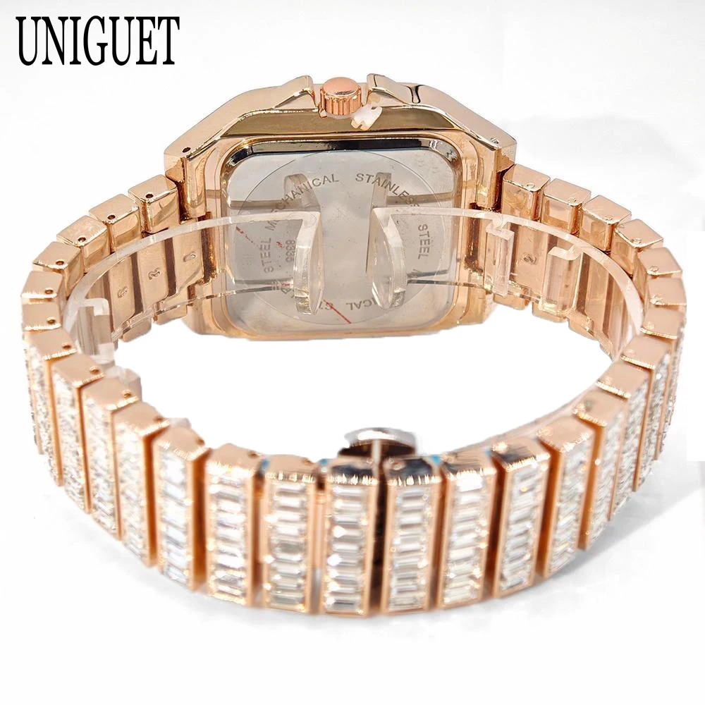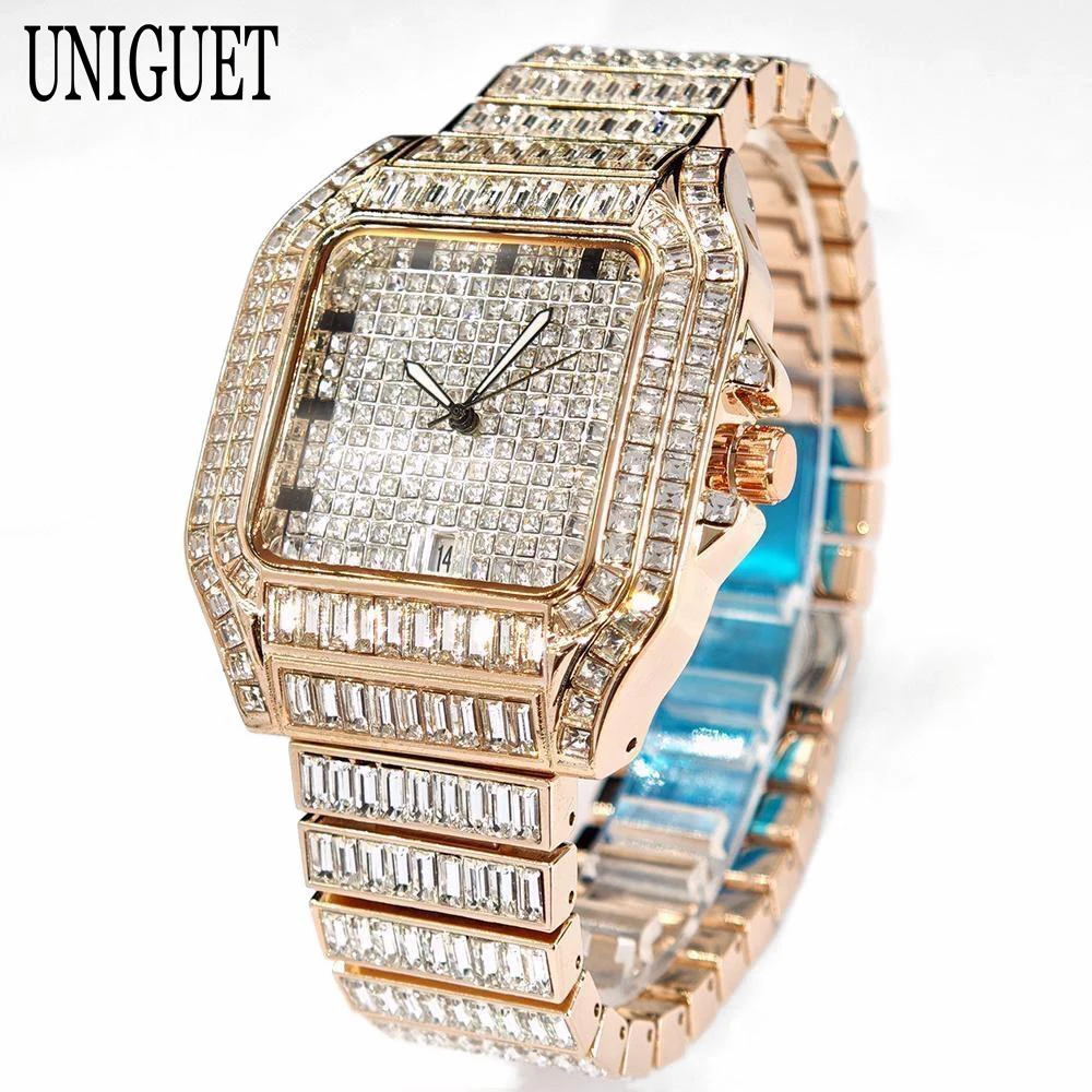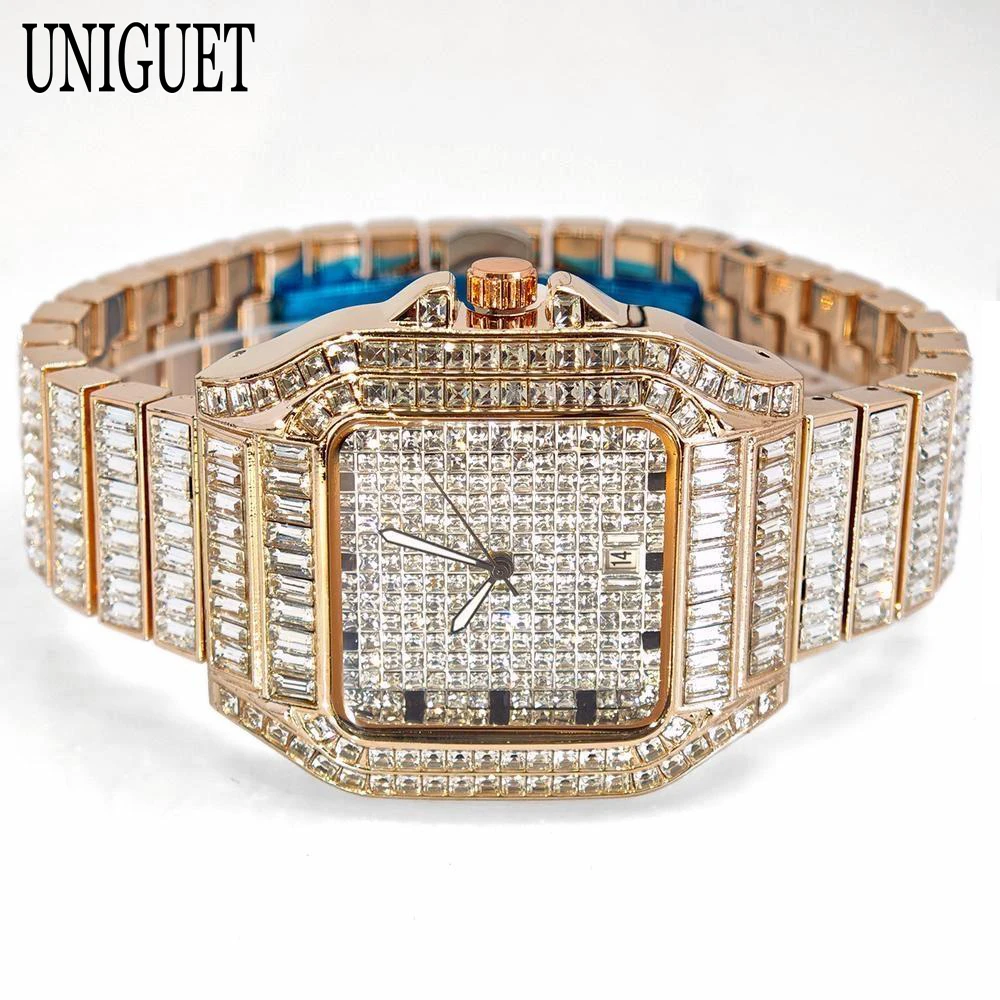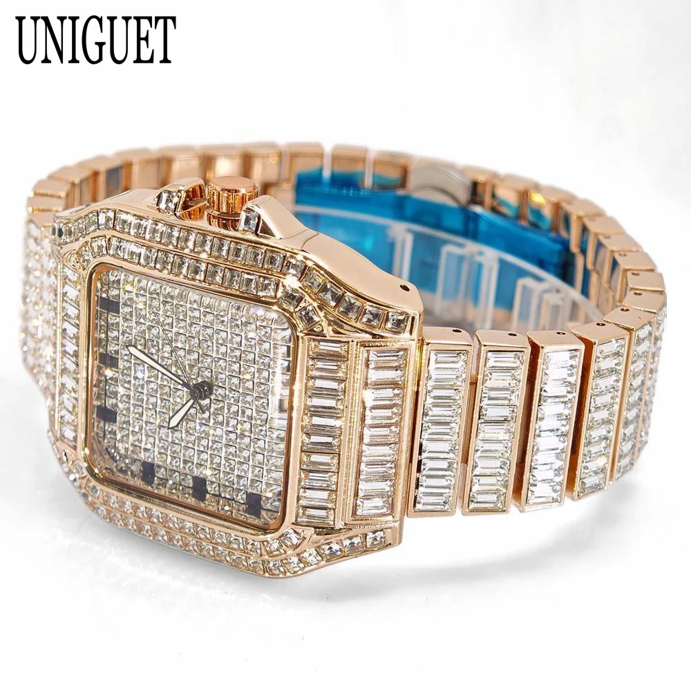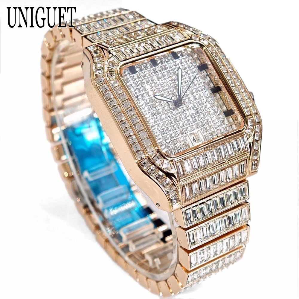 Luxury Rose Watch For Man Fashion Stainless steel Quartz Watches Men Hip Hop Rectangle Iced Out Diamond Wrist Watch reloj hombre