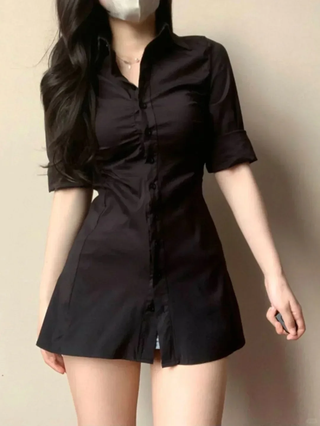Sexy Pleated Shirt Dress Women's Slim Fit Waist Cinching Mini Dress Korean Pure Desire Design Sensual Polo Collar Knee Length